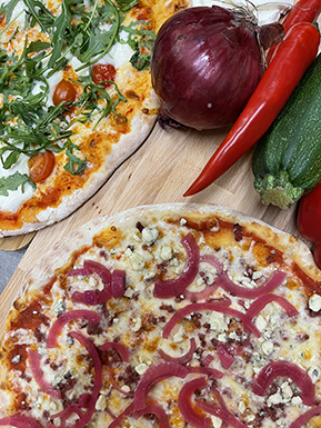 | Mozzarella, savuporo, herkkusieni, sinihomejuusto, pikkelöity punasipuli | |