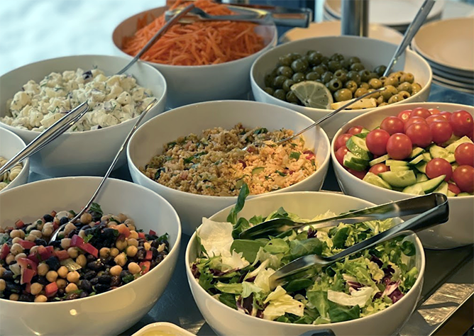Lounas katetaan ti-pe klo 11:00 15:00. Lounaamme kostuu monipuolisen ja raikkaan salaattipöydän lisäksi lämpimistä ruokavaihtoehtoista, joka tarjoillaan lautasannoksena.